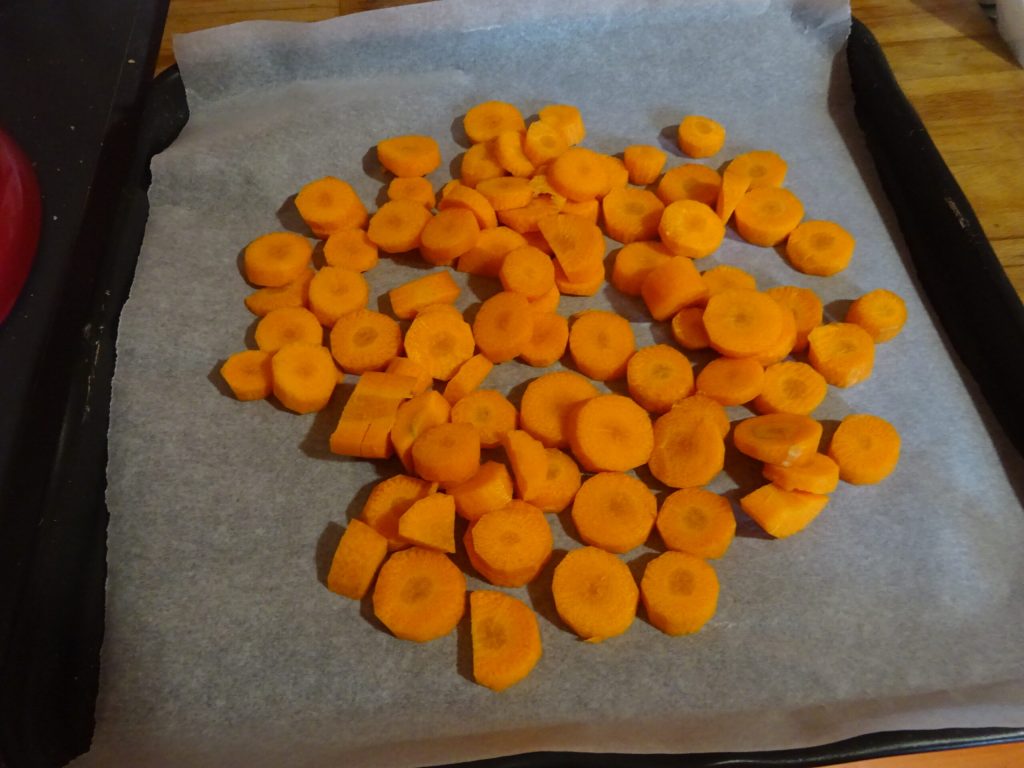 Waschen und schälen Sie die Karotten, dann schneiden Sie sie in Scheiben mit einer Dicke von etwa einem halben Zentimeter und legen sie auf ein mit Backpapier ausgelegtes Backblech.