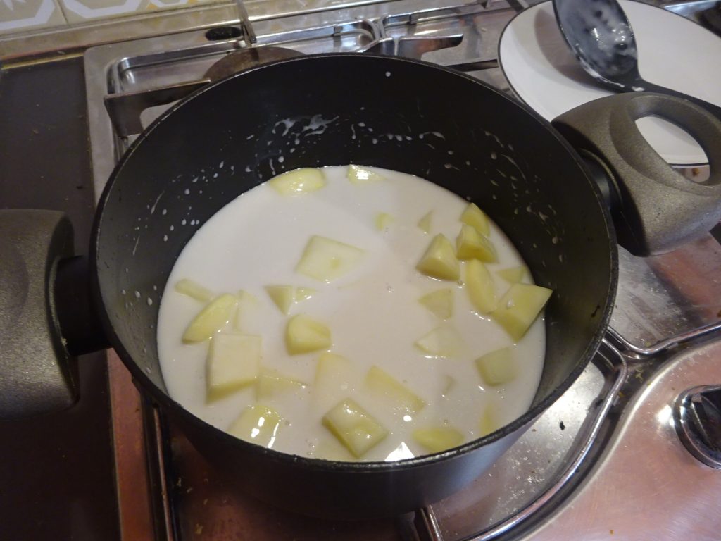 Sobald die Kartoffeln geschnitten sind, gib sie in einen Topf und füge die Kokossahne hinzu.