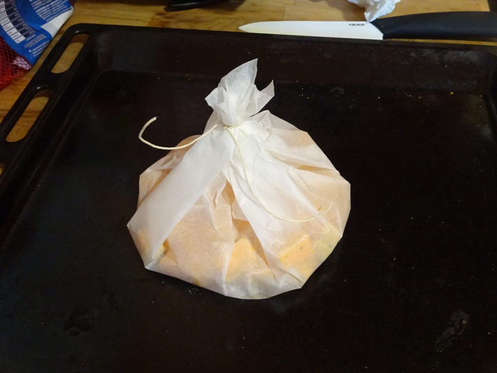 Verschließen Sie das Backpapier zu einem Beutel mit Küchengarn und backen Sie es im vorgeheizten Ofen bei 180° für 10 Minuten.