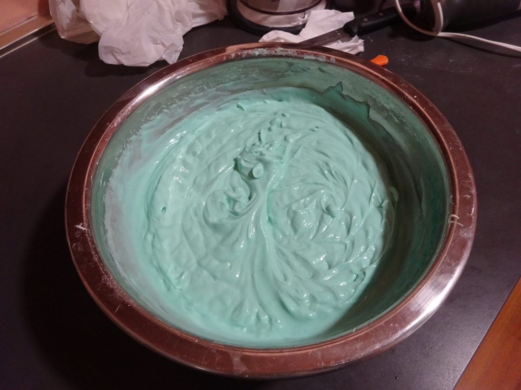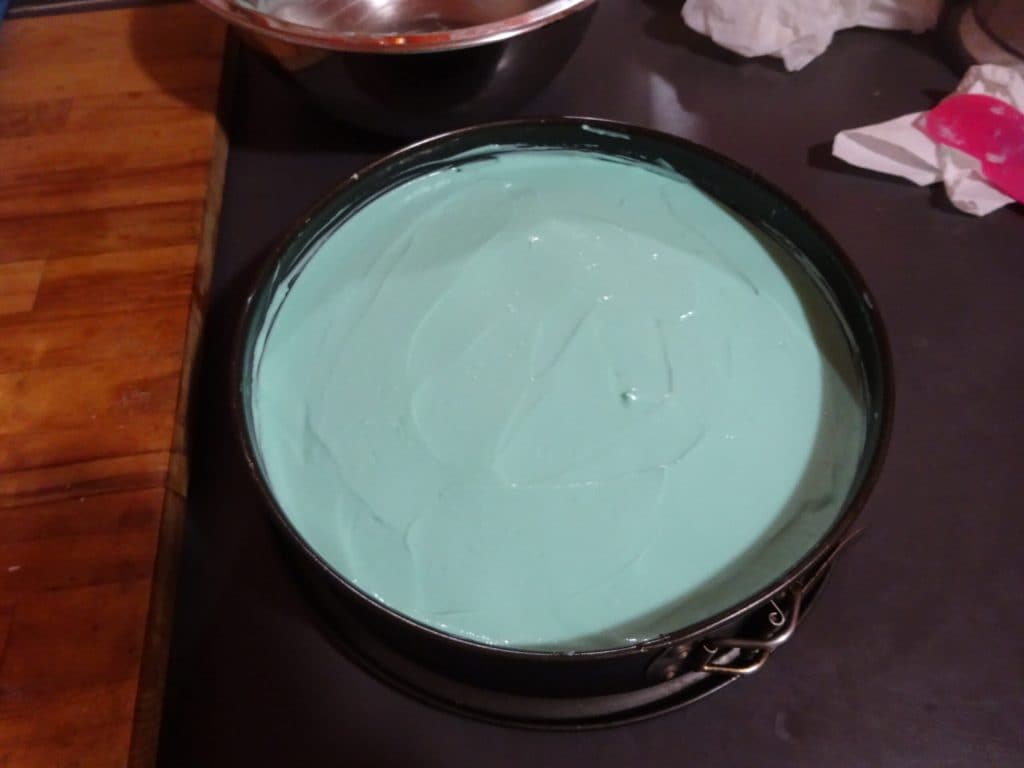 Sobald die Minzcreme fertig ist, nehmen Sie den Boden aus dem Kühlschrank und gießen Sie die Creme auf die Keksmasse.