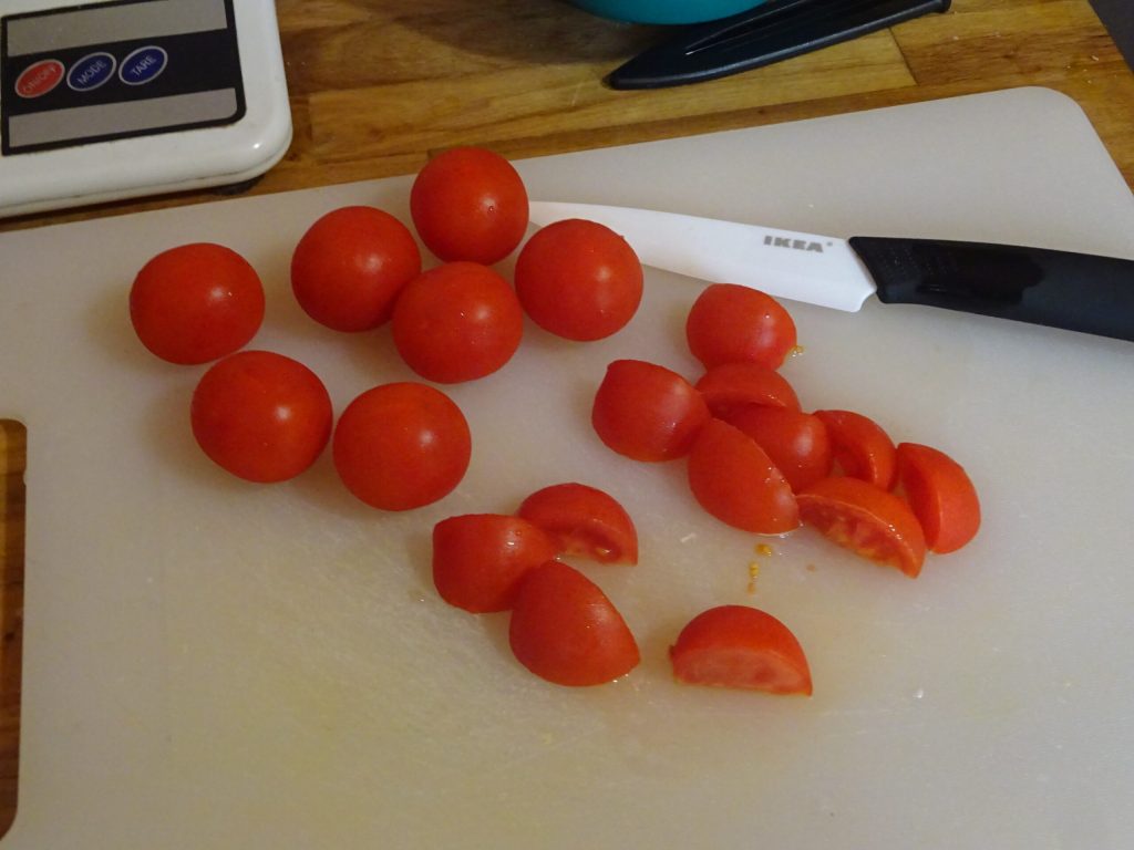 Nun die Kirschtomaten gut waschen und trocknen. In Viertel schneiden, wenn sie groß sind, ansonsten nur halbieren.