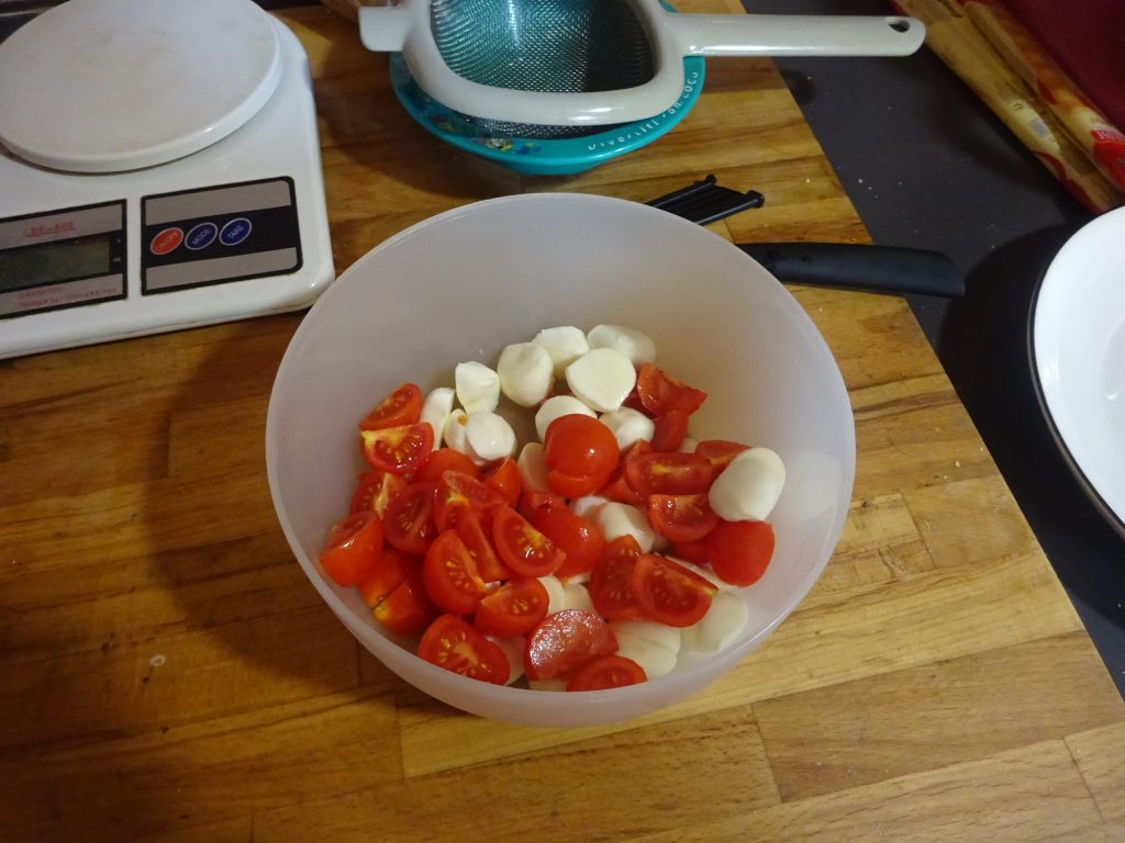 Dann zu den Kirschtomaten und Mozzarella-Kugeln in die Schüssel geben, mischen und zur Seite stellen, damit es durchzieht.