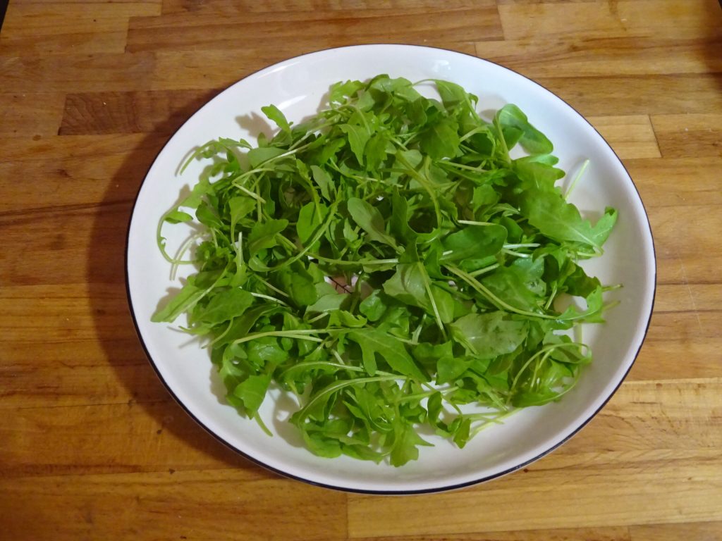 Während die Mandeln abkühlen, den Rucola auf den Tellern, die verwendet werden, verteilen.