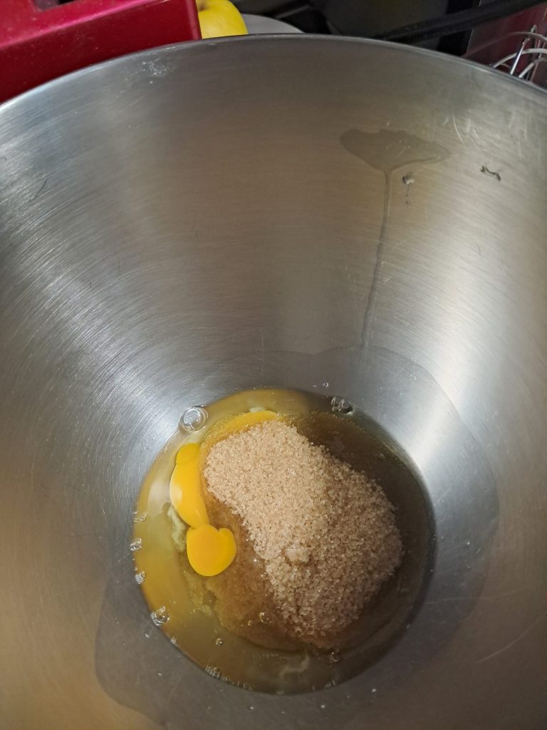 In die Schüssel der Küchenmaschine brechen Sie 2 Eier und fügen den braunen Zucker hinzu.