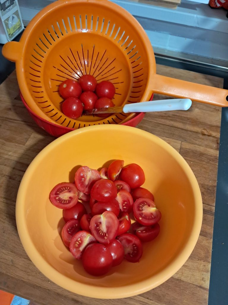 • Waschen und trocknen Sie die Kirschtomaten gut ab, dann halbieren Sie sie und geben Sie sie in eine Schüssel.