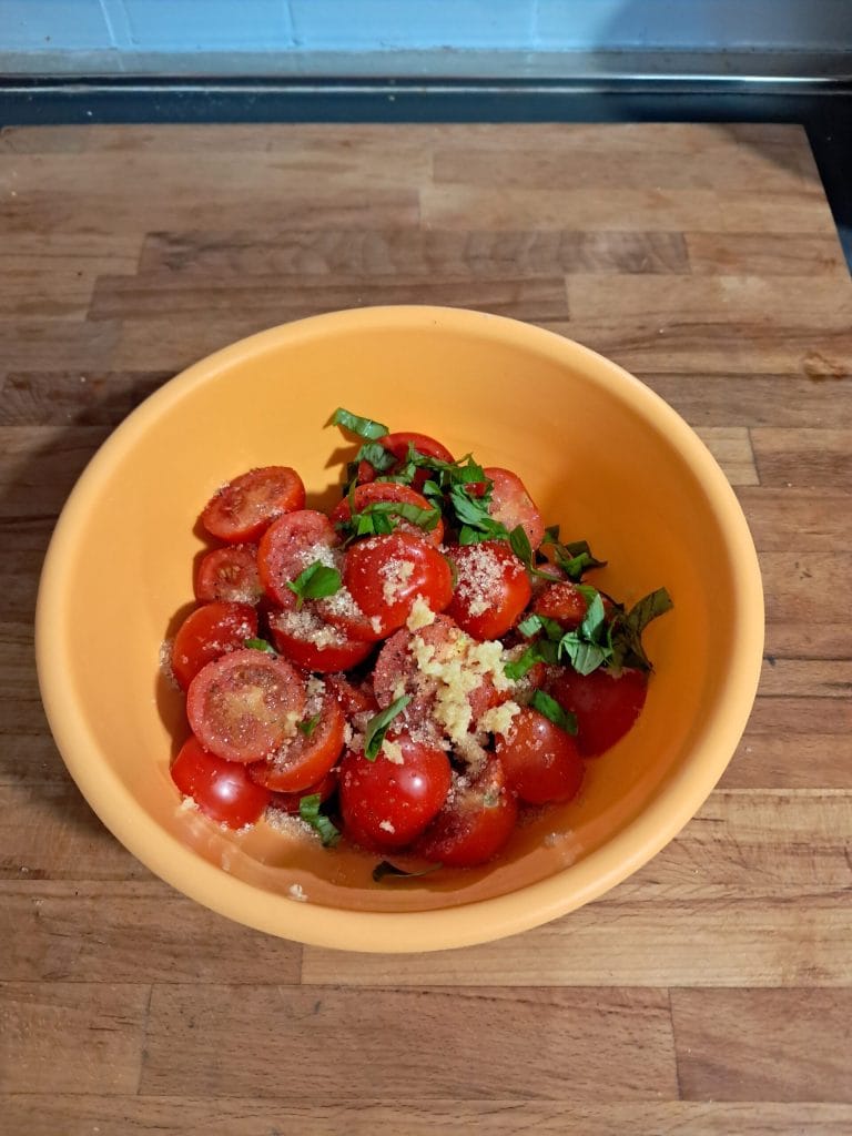 • Schälen Sie nun die Knoblauchzehen und pressen Sie sie über die Kirschtomaten. Fügen Sie auch braunen Zucker, 2 Prisen Salz, 1 Prise Pfeffer und die zerkleinerten Basilikumblätter hinzu. Zum Schluss das Öl hinzufügen und mischen.