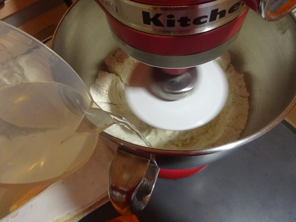 Fügen Sie die zerbröckelte Hefe und den Zucker hinzu. Starten Sie die Küchenmaschine und geben Sie etwa 2/3 des Wassers hinzu. Kneten Sie, bis das Wasser vollständig vom Mehl aufgenommen ist.