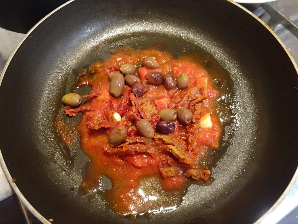 Sobald sie geschnitten sind, geben Sie sie in die Pfanne mit dem Tomatenfleisch und fügen auch die Oliven hinzu.