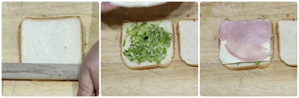 Auf die erste Scheibe einen Esslöffel Zucchini geben, dann eine Scheibe Schmelzkäse (Sottiletta), darauf Kochschinken, wieder Schmelzkäse, nochmals Zucchini und mit einer weiteren Brotscheibe verschließen.