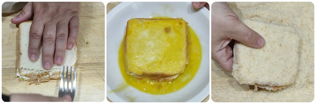 In einem Teller ein Ei verquirlen (je eines nach dem anderen) und das Brot darin rundherum wenden, sodass es komplett bedeckt ist.