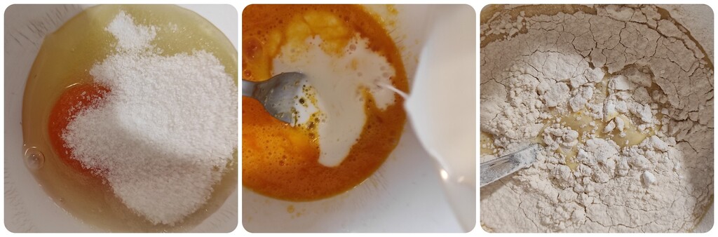 Butter schmelzen, auch in der Mikrowelle für 45 Sekunden oder im Wasserbad. Die Eier mit dem Zucker schlagen und die Milch hinzufügen. Die geschmolzene, aber nicht heiße Butter und die Prise Salz hinzufügen, dann gut schlagen, um eine homogene Mischung zu erhalten. Das gesiebte Mehl und das Backpulver hinzufügen und gut vermengen. Die Mischung in einen Spritzbeutel füllen.