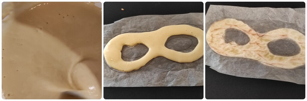 Erhitze eine Antihaftpfanne (wir haben eine Princess Elektrische Crepiera verwendet, Affiliate-Link), dann das Backpapier auf die Crepiera legen, die Bleistiftseite muss nach unten zeigen, sonst landet sie auf dem Pfannkuchen. Mit dem Spritzbeutel die Form der Maske zeichnen. Wenn sich Blasen an der Oberfläche bilden und platzen, den Pfannkuchen mit einem Spatel umdrehen, um ihn auch auf der anderen Seite zu bräunen, und entfernen. Diesen Vorgang wiederholen, bis der Teig aufgebraucht ist.