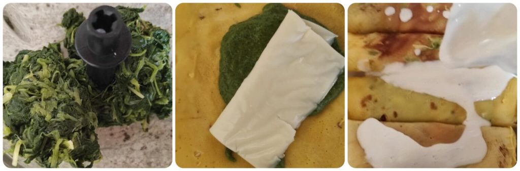Nimm jeweils eine Crêpe und verteile in der Mitte zwei Esslöffel Spinatcreme.