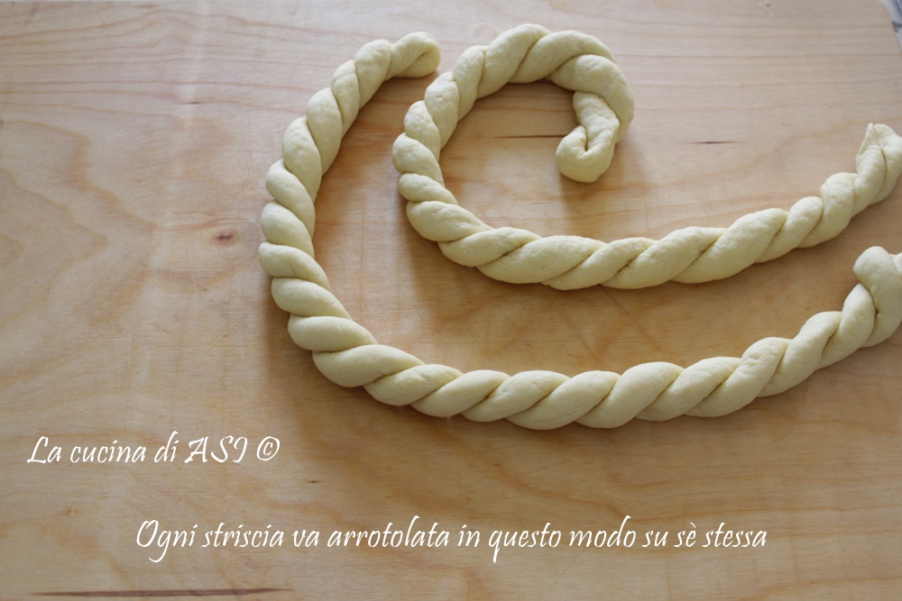 • Um mit der Zubereitung des COLAC, dem typischen rumänischen Osterbrot, fortzufahren, überkreuze ich die erste Rolle in der Mitte ihrer Länge und rolle dann ein Ende über das andere, wie auf den Fotos zu sehen ist. Dasselbe mache ich mit beiden 120-cm-Strängen.