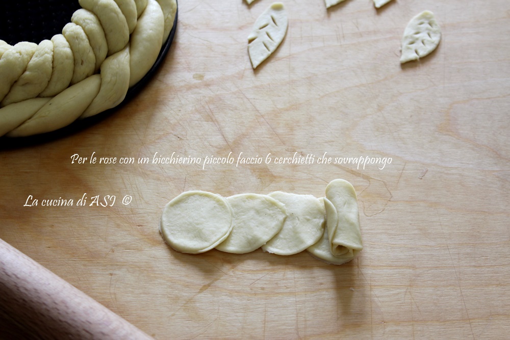 • Ich lasse etwas Teig übrig, um Blätter und Rosen (oder was ihr bevorzugt) zu formen, und rolle eine weitere Strähne von etwa 120 cm, die ich wieder wie zuvor einrolle.