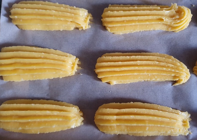 Nun sind wir bereit, die Mischung in den Spritzbeutel zu füllen und die Eclairs zu formen, die nicht zu nah beieinander auf dem mit Backpapier ausgelegten Backblech platziert werden sollten. Wie ihr seht, habe ich große Artischocken gemacht, dann habe ich Haken gemacht: kurz gesagt, ein großes Chaos von Eclairs aus Brandteig unterschiedlichster Art!