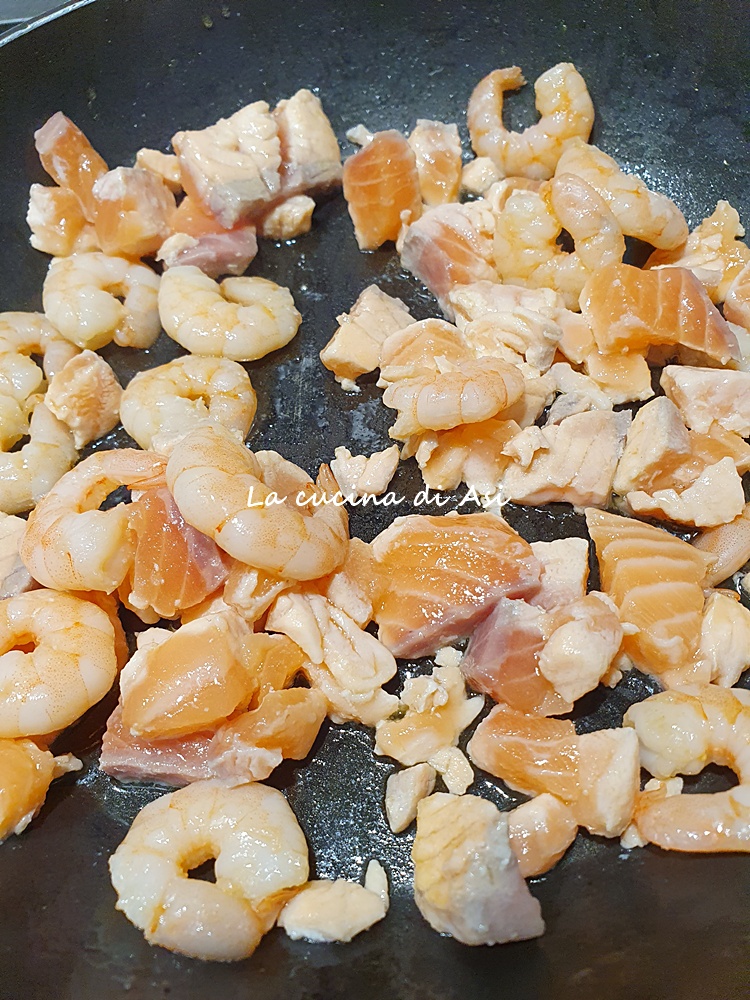In einer Pfanne mit Öl und Knoblauch die Garnelen für 2-3 Minuten anbraten, die Lachsstücke hinzufügen und weitere 4-5 Minuten kochen. Entfernen Sie dann den Knoblauch und lassen Sie die Mischung abkühlen.