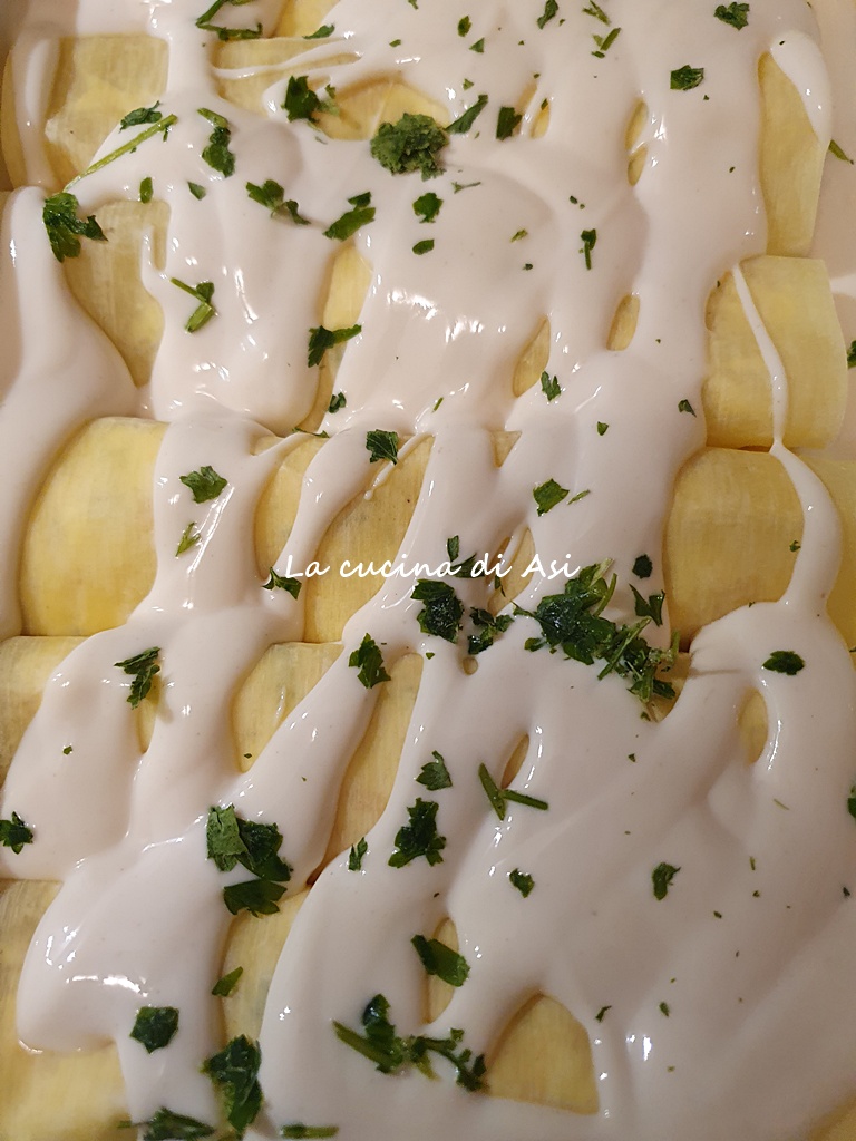 Ich habe die frischen Blätter verwendet, ohne sie zu blanchieren, da sie sehr dünn waren, aber Sie können auch die trockenen CANNELLONI verwenden: in diesem Fall ist es wichtig, eine flüssigere Bechamel zuzubereiten, damit die Pasta während des Backvorgangs perfekt kocht.