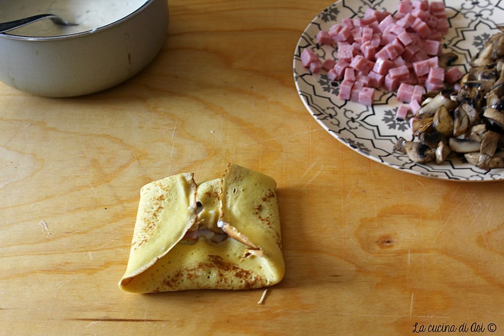 • Wir legen eine Crêpe auf eine Fläche, geben in die Mitte etwas Pilze, fügen ein paar Würfel gekochten Schinken hinzu und streichen etwas Bechamelsoße darüber.