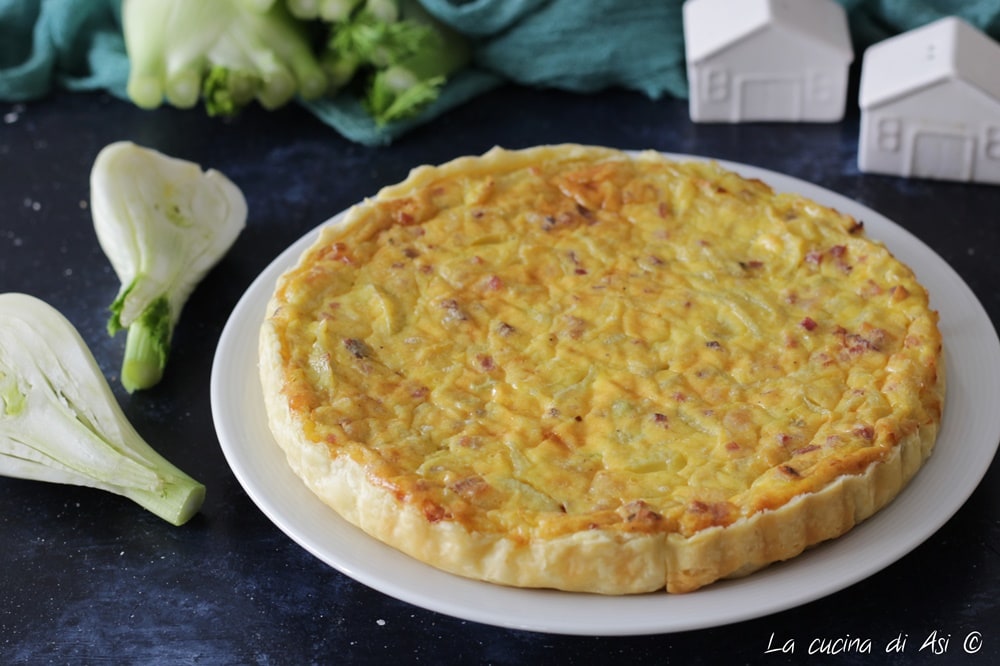 OKOK … kommen wir zum Rezept, dieser cremige und schmackhafte Quiche ist sehr appetitlich mit Fenchel, der in der Pfanne mit Knoblauch und Salbei angebraten wird, und dann mit der würzigen Zugabe von Speckwürfeln, die ihn sehr schmackhaft machen!