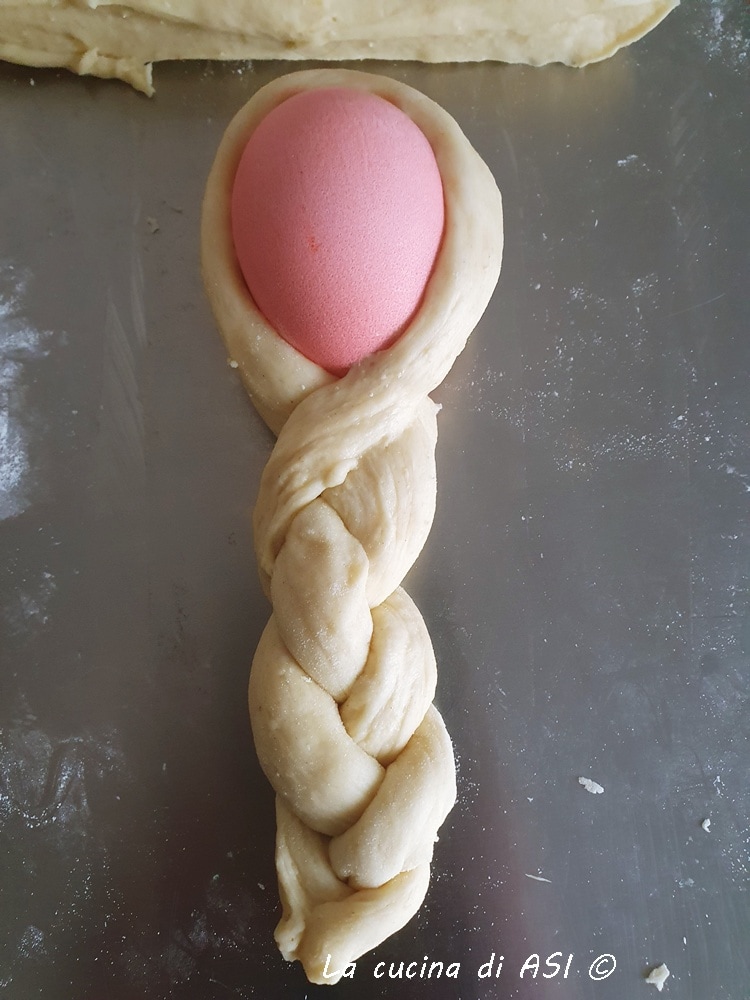 In jedem Brötchen, das durch das Teilen des Gesamtteiges entstand, nehme ich ein Stück, das das lange Teil sein wird, das das gefärbte Ei umhüllt (oben habe ich erklärt, wie man die Eier färbt) und lasse zwei der Enden des Zopfes herunterhängen.
