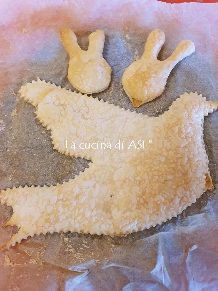 Ehrlich gesagt wollte ich sie nicht mit Eigelb bestreichen und nachdem ich sie hier und da durchstochen hatte, um sie nicht zu hoch werden zu lassen (aber wie ihr seht, ist sie schief und ich habe es nicht geschafft), habe ich die beiden Tauben zusammen mit ein paar eingeschmuggelten Hasen gebacken, haha!