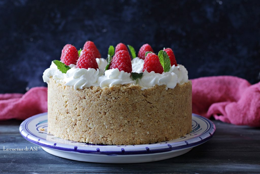 Zu diesem Zeitpunkt, wenn wir den Cheesecake im Voraus zubereitet haben, decken wir ihn mit Frischhaltefolie ab und stellen ihn bis zum Genuss in den Kühlschrank oder fahren mit der endgültigen Dekoration fort, indem wir die Sahne aufschlagen, die ich in regelmäßigen Häufchen am äußeren Rand der Torte anbringe, um dann eine Himbeere und ein Minzblatt hinzuzufügen und so die Vorbereitung meines prächtigen und leckeren marmorierten Beeren-Cheesecakes abzuschließen.
