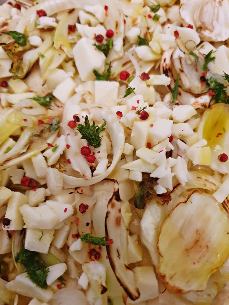 Ich habe ein erstes Mal für etwa 1,5 Stunden gehen lassen, dann mit leicht geölten Fingern ausgerollt und ein zweites Mal gehen lassen, mit Fenchel, der auf der Antihaftplatte für ein paar Minuten weich gemacht wurde, einem gehackten Schalottenschnittlauch, einem schönen Stück Provola/ Provolone/Fontina (je nach dem, was im Kühlschrank ist) und einigen rosa Pfefferkörnern gewürzt und …noch einmal gehen lassen (das sind dann 3) für 15/20 Minuten!