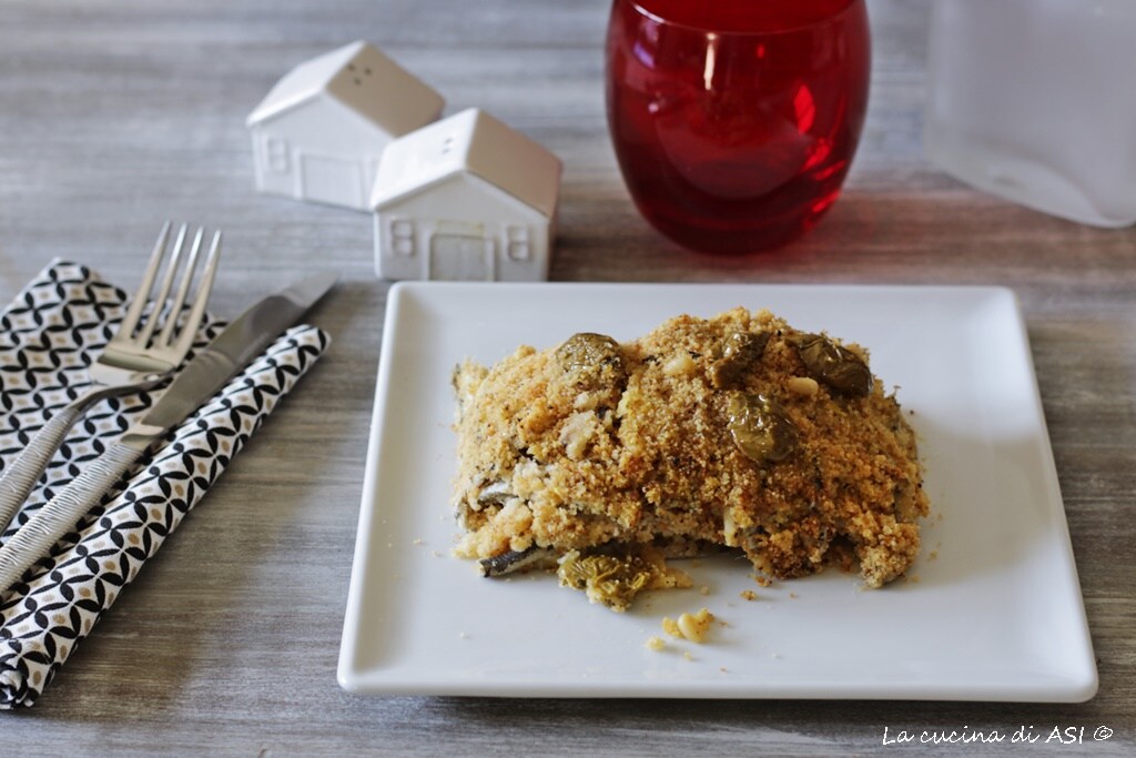 Ich wiederhole die Reihenfolge der Zutaten und mache weitere Schichten, bis die frischen Sardellen aufgebraucht sind.Ich gieße den Weißwein in die Backform, füge eine Prise Salz hinzu und bedecke diese Schichten mit dem zuvor in der Pfanne gerösteten Paniermehl.