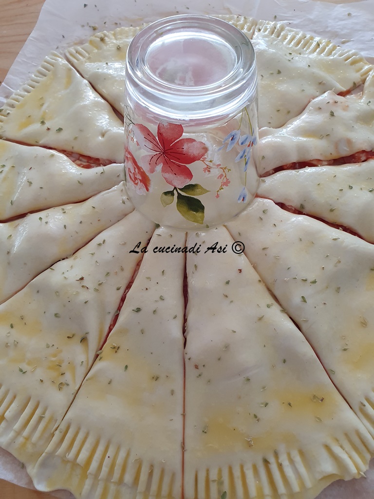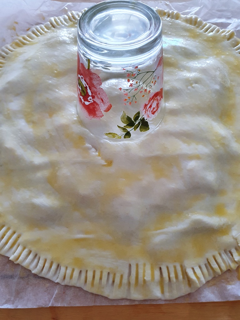 3) An diesem Punkt lege ich den zweiten Blätterteig darüber und verschließe den Rand der Sonnentorte perfekt mit einer Gabel. Ich stelle ein Glas oder ein anderes rundes Utensil wie einen Ausstecher in die Mitte. Verwenden Sie das, was für Sie am praktischsten ist!