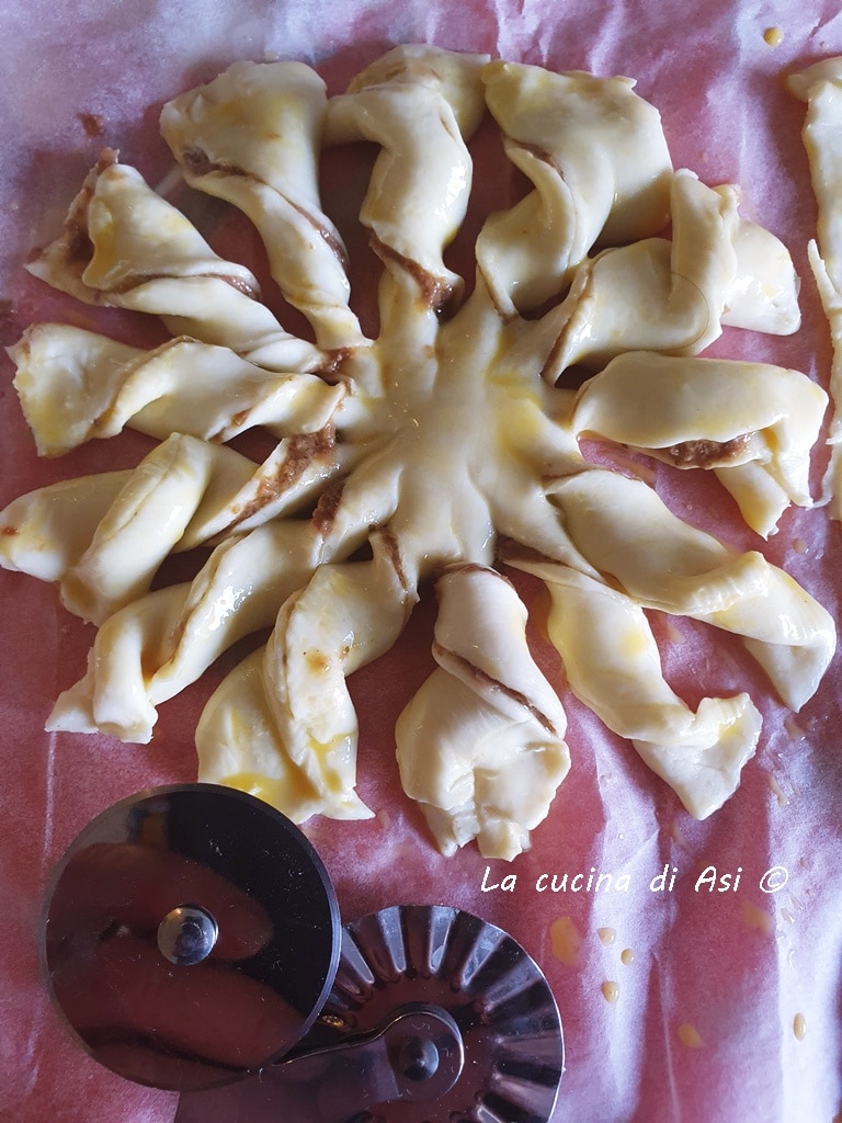 Mit einem gezackten oder glatten Rad schneide ich viele Blütenblätter, wobei ich den Kreis intakt lasse, und pinsel dann die Mischung aus Eigelb und Wasser darauf.