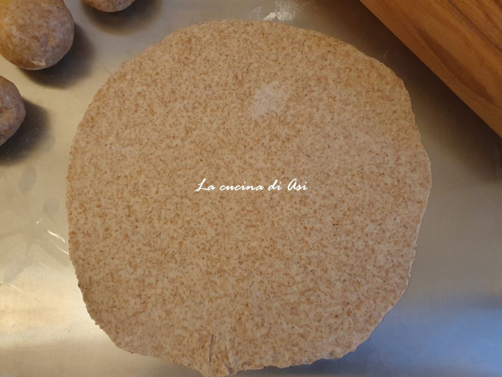 Rollen Sie jede Kugel zu einer sehr dünnen Piadina auf der mit Mehl 00 leicht bemehlten Arbeitsfläche aus, denn Vollkornmehl mit Kleie würde beim Kochen in der Pfanne verbrennen.