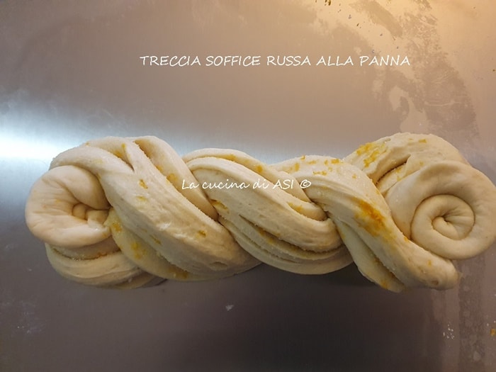 Ich wollte keinen zu süßen russischen Brioche-Zopf mit Sahne machen und habe mich entschieden, etwas Kristallzucker und die Schale von zwei kleinen unbehandelten Orangen hinzuzufügen.