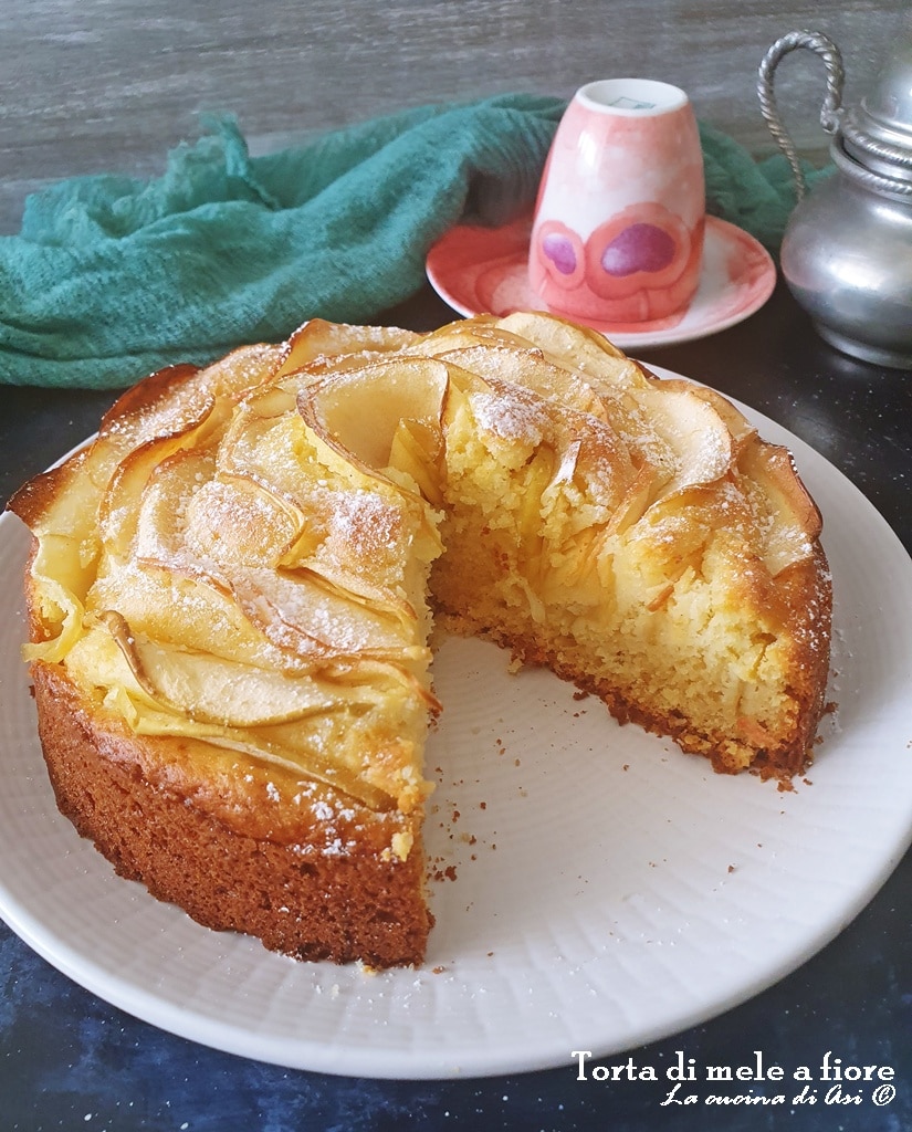 PS: Kaum hatte ich diesen Kuchen aus dem Ofen geholt, habe ich versucht, ihn für zwei Fotos ganz zu lassen … aber nichts zu machen: Andrea kam wie ein Falke und schnitt ein noch warmes Stück, indem er versuchte, auch die Apfelblütenblätter zu schnappen! Ich hatte nicht einmal Zeit, ihm zu sagen: „Warte, ich muss die Fotos fertig machen!“ Aber schau dir die Schönheit des Inneren an: weich, feucht und duftend, mit dieser Apfelblüte, die ihn unwiderstehlich macht. Ein einfacher Kuchen, der, ich sag’s dir, im Nu verschwindet.