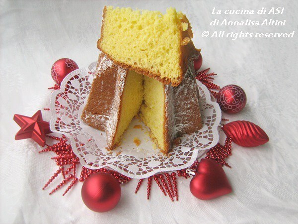 Ich schneide den Pandoro in Scheiben, drücke sie ein wenig flach (aber mache keinen Boden daraus) und bedecke die ganze Form, versuche dabei, keine leeren Stellen zu haben… zumindest habe ich es versucht!