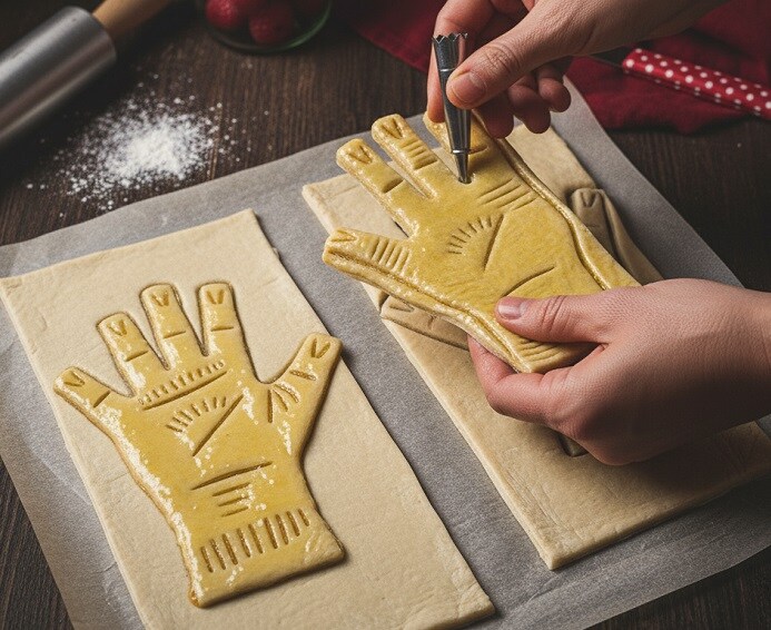 Dieses Rezept hat keine historischen oder regionalen Ursprünge; es ist ein klassisches Beispiel für moderne Themenküche und Visual Food. Die Technik, Blätterteig zu verwenden, um dreidimensionale Formen zu erstellen, ist alt, aber die Idee, ihn in Form einer „abgetrennten Hand“ zu modellieren, ist ein Phänomen, das dank der sozialen Medien und Kochblogs in den 2000er Jahren entstanden und verbreitet wurde und zu einem Halloween-Must-have wurde. Ihre Popularität stammt aus der Kombination eines erkennbaren makabren Symbols (der Hand) mit der schnellen Durchführung von fertigem Blätterteig.