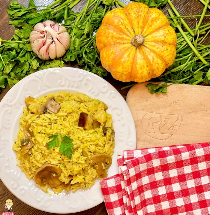 Diese Woche jedoch hat sich die perfekte Kombination ergeben und so habe ich mich entschieden, dieses cremige Risotto mit Kürbis und Pilzen zuzubereiten, das sogar meinen Mann verrückt gemacht hat, der kein großer Kürbisfan ist.