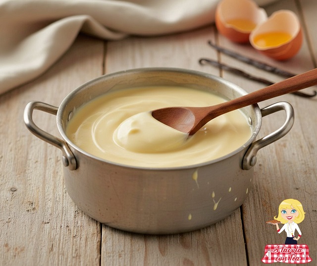Erhitze in einem kleinen Topf Milch und Sahne zusammen mit der geriebenen Zitronenschale. Separat Eigelbe und Zucker verrühren, dann die Stärke hinzufügen. Gieße die heiße Flüssigkeit auf die Mischung, rühre um und stelle alles bei geringer Hitze wieder auf den Herd, bis die Creme andickt. In eine flache Form geben, mit Frischhaltefolie direkt auf der Oberfläche abdecken und vollständig abkühlen lassen (zuerst bei Zimmertemperatur, dann im Kühlschrank).