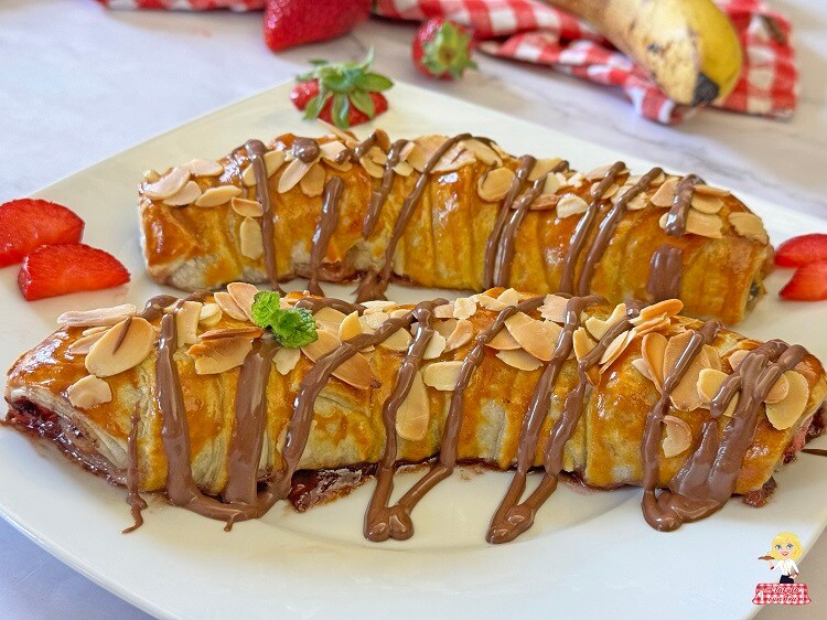 Warum wird dir dieses Bananen- und Schokoladendessert gefallen? Erstens ist es ein sehr einfach zuzubereitendes Dessert, das keine Kochfähigkeiten und auch keine Werkzeuge erfordert. Die Zutaten sind wenige: Du brauchst nur einen Blätterteig, Bananen, Nuss-Nougat-Creme (ich habe Nutella verwendet) und ein paar Erdbeeren.