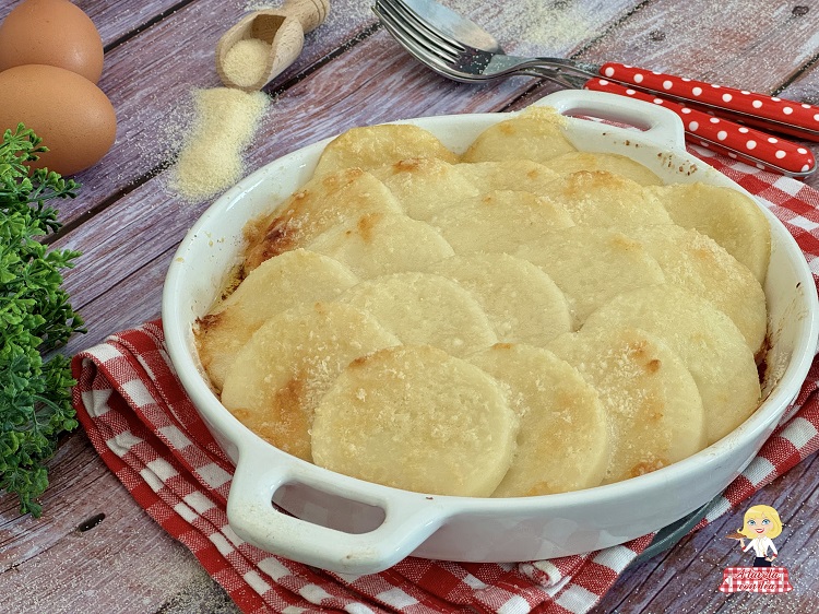 • Nach der Ruhezeit nimm die Masse aus dem Papier und schneide mit einem Messer Scheiben von etwa 1 cm Dicke. Lege die Scheiben in eine leicht gebutterte Auflaufform und schichte sie übereinander. Bestreiche sie mit der restlichen Butter (70 g), die du zuvor geschmolzen hast, und bestreue sie großzügig mit geriebenem Pecorino Romano.