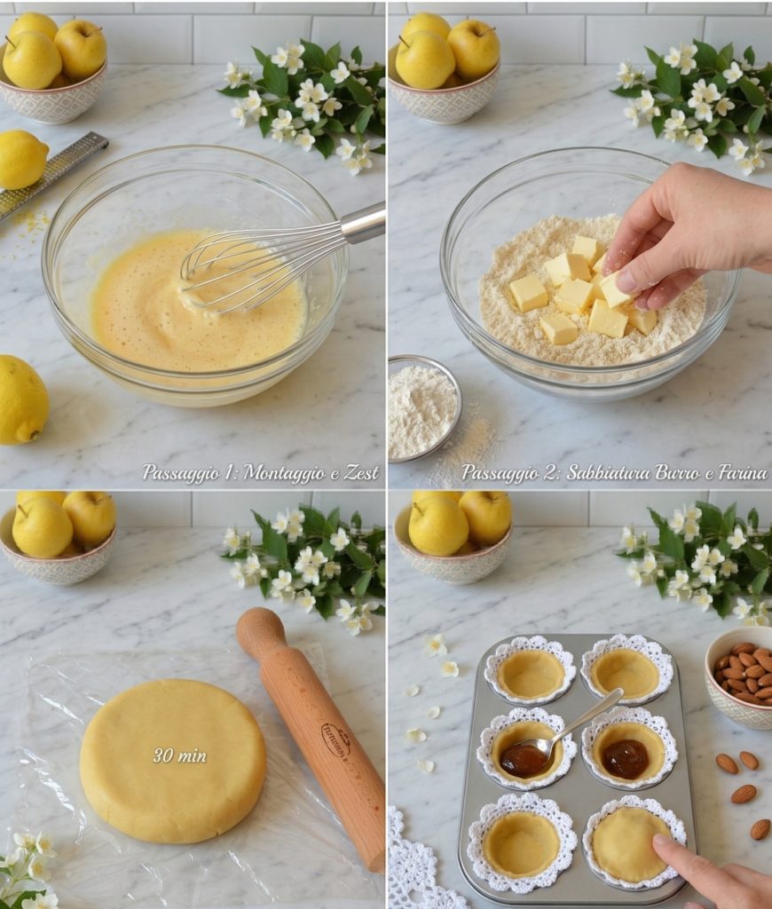 In einer Schüssel die Eigelbe mit dem Zucker und einer Prise Salz mit dem Handmixer aufschlagen. So lange rühren, bis eine helle, luftige und schaumige Masse entsteht. Dann die weiche Butter in Stücken und die Zitronenschale hinzufügen und weiter schlagen, bis alles gut verbunden ist.