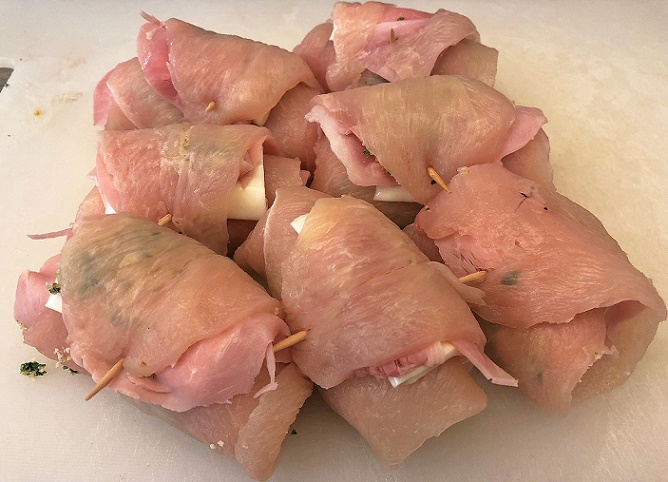 • Nimm die Hähnchenbrustscheiben; falls sie nicht dünn genug sind, klopfe sie vorsichtig mit einem Plattiereisen flach, achte darauf, sie nicht zu zerreißen. Lege die Hähnchenscheiben nebeneinander auf ein Schneidebrett, damit du sie leicht „seriell“ füllen kannst.