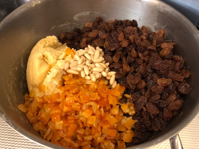 Rosinen, Orangenschalen und Pinienkerne hinzufügen und erneut kneten, bis ein homogener Teig entsteht.