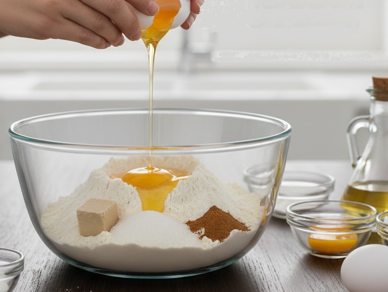 • Gib in eine große Schüssel das Mehl, den Zucker, das Backpulver, den Zimt und das Ei. Beginne zu mischen und füge nach und nach die Milch und das Öl hinzu. Knete gut mit den Händen, bis du einen weichen, glatten Teigklumpen erhältst, der nicht mehr an den Fingern klebt. Wickle ihn in Frischhaltefolie und lass ihn etwa 30 Minuten bei Zimmertemperatur ruhen: Dieser Schritt ist entscheidend, damit der Teig elastisch wird.