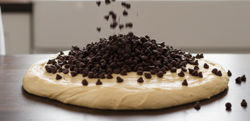 • Den gegangenen Teig vorsichtig ausbreiten und die Zartbitter-Schokotropfen verteilen. Den Teig mehrmals übereinander falten, damit sie gut eingearbeitet werden. Den Teig in zwei Stücke teilen, rundwirken (durch Rollen auf der Arbeitsfläche) und weitere 2–3 Stunden gehen lassen, bis sich das Volumen verdoppelt hat.