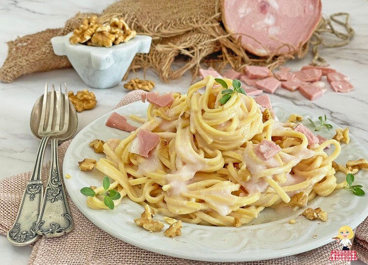 Die Pasta und Mortadella ist ohne Sahne und wird durch Frischkäse kombiniert mit gehackten Nüssen, die dem Gericht eine knusprige Note verleihen, cremig.