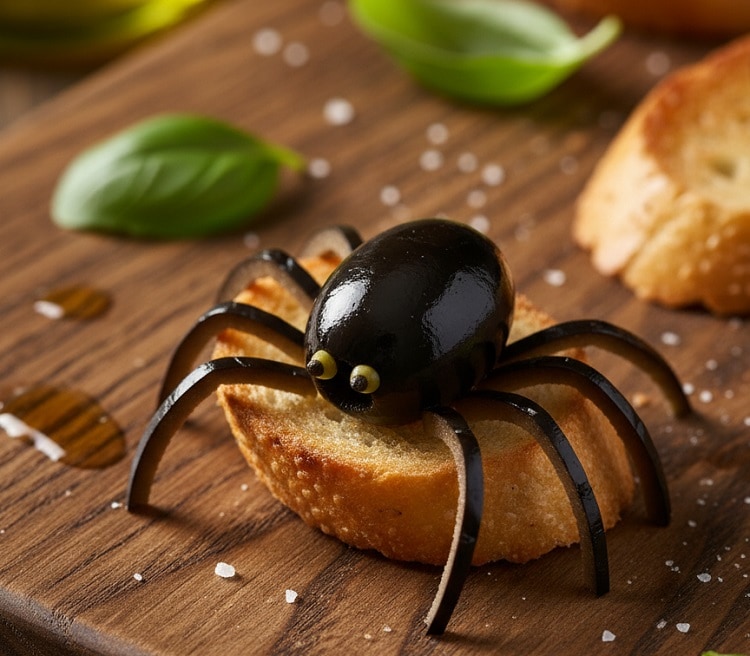 „Schreckliche“ Dekoration: Anstelle der Olivenspinnen können Sie „Gespenster“ aus Mozzarella (mit einem runden Ausstecher und einem kleinen Schnitt für den Schwanz) oder „Schädel“ aus Blätterteig mit einem kleinen schädelförmigen Ausstecher auf dem Spinnennetz basteln.