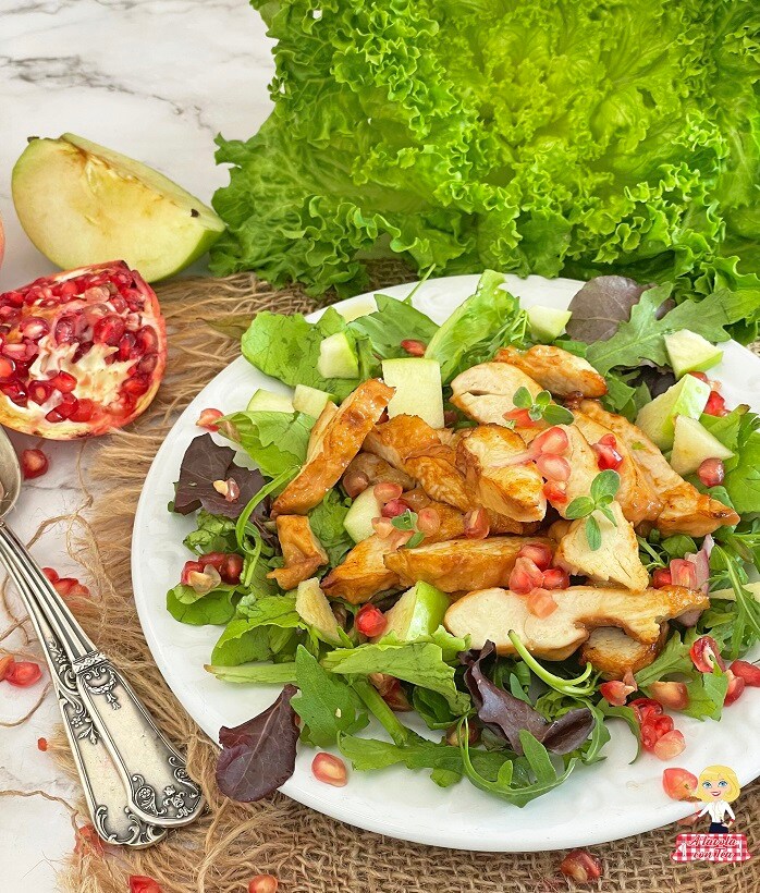 Der Salat mit Huhn und Granatapfel ist ein gesundes und schmackhaftes, schnell zuzubereitendes und preiswertes Gericht für ein leichtes, aber vollständiges Mittagessen, das auch für die Weihnachtszeit geeignet ist. Um sich nicht zwischen den Festmahlen zu sehr zu belasten und dennoch ein buntes und einladendes Gericht auf den Tisch zu bringen.