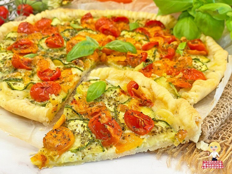 Heute bereiten wir das Rezept der Sommerlichen herzhaften Torte zu, die bei uns zu Hause am beliebtesten ist, mit einem Mürbeteigboden und einer Füllung aus saisonalem Gemüse wie Paprika, Zucchini und Tomaten, angereichert mit geschmolzenem Scamorza-Käse.