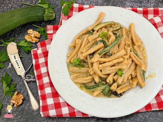 Dies ist eines der vielseitigsten Rezepte mit Walnüssen. Wir können sie als Walnussoße für Pasta verwenden und damit Linguine, Spaghetti oder kurze Pasta nach unserer Wahl würzen. Mischen Sie die Soße zusammen mit einem Schöpflöffel Kochwasser und Sie erhalten ein gut gemischtes und sehr schmackhaftes Dressing. Sie eignet sich auch hervorragend zum Füllen von Sandwiches, Piadine, Crostini und als Begleitung zu Gemüse oder Hauptgerichten.